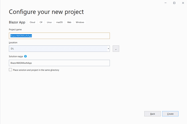 - Enter your project name and click Create. In my example, I’ve used the name BlazorWASMAuthApp.