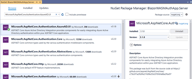 - First, install the NuGet package Microsoft.AspNetCore.Authentication.AzureAD.UI, which is used for authenticating API calls.Refer to the following screenshot.
