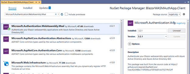 - Install the NuGet package Microsoft.Authentication.WebAssembly.Msal to authenticate your application using NuGet Manager.