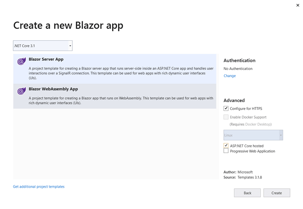 - Then, select Blazor WebAssembly App from the list and check the Configure for HTTPS and ASP.NET Core hosted check boxes. Then, select Create.