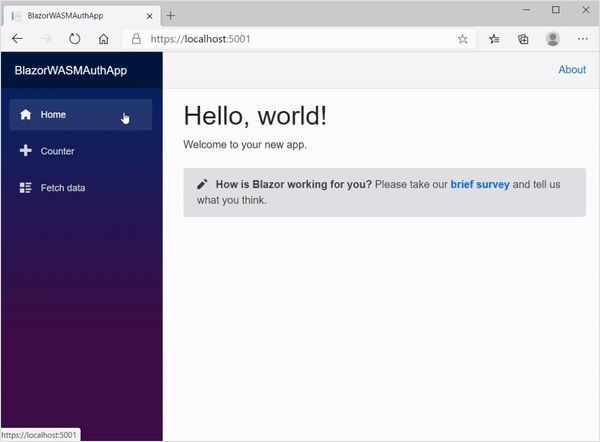 Shared/LoginDisplay.razor@using Microsoft.AspNetCore.Components.Authorization @using Microsoft.AspNetCore.Components.WebAssembly.Authentication @inject NavigationManager Navigation @inject SignOutSessionStateManager SignOutManager <AuthorizeView> <Authorized> Hello, @context.User.Identity.Name! <button class="nav-link btn btn-link" @onclick="BeginLogout"> Log out </button> </Authorized> <NotAuthorized> <a href="authentication/login">Log in</a> </NotAuthorized> </AuthorizeView> @code { private async Task BeginLogout(MouseEventArgs args) { await SignOutManager.SetSignOutState(); Navigation.NavigateTo("authentication/logout"); } }Pages/Authentication.razor