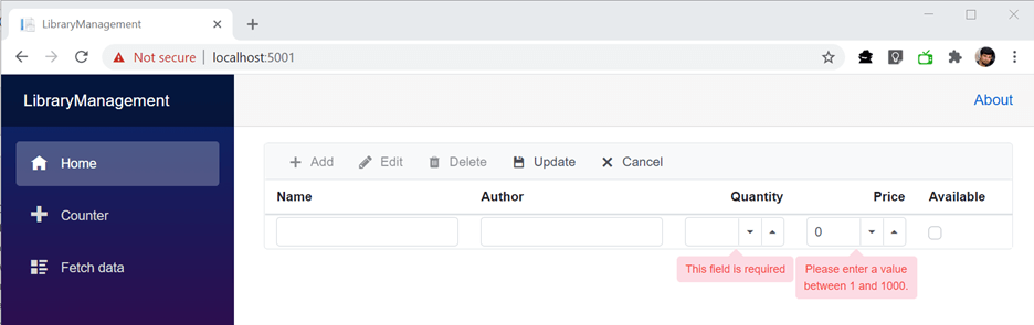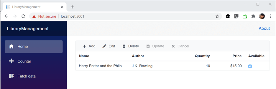 To demonstrate CRUD operations in the Syncfusion Blazor DataGrid component, we are going to create a simple library book management application. The final code can be found in this GitHub repository.