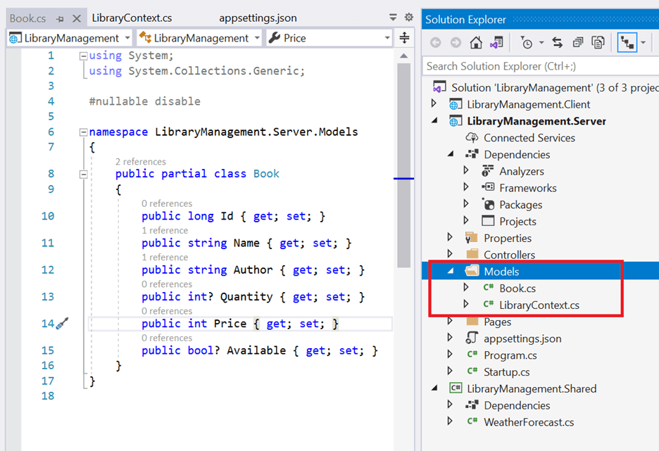 Before adding Syncfusion Blazor components to the application, we need to move the Book.cs file to the LibraryManagement.Shared project, as it is required in both client and server projects.