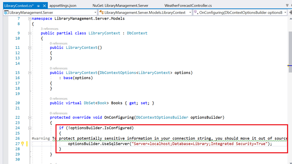 We can see that the LibraryContext.cs file contains the connection string details in the OnConfiguring method.