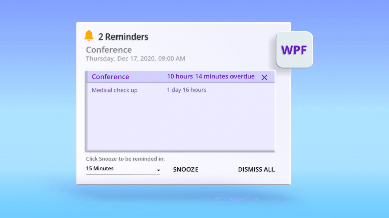 The Syncfusion WPF Scheduler control comes with appointment reminder support in the 2020 Volume 4 release. This will alert you to appointments via reminders with complete data-binding support. You can also send reminder messages through SMS or email with the help of external packages to keep track of appointments.