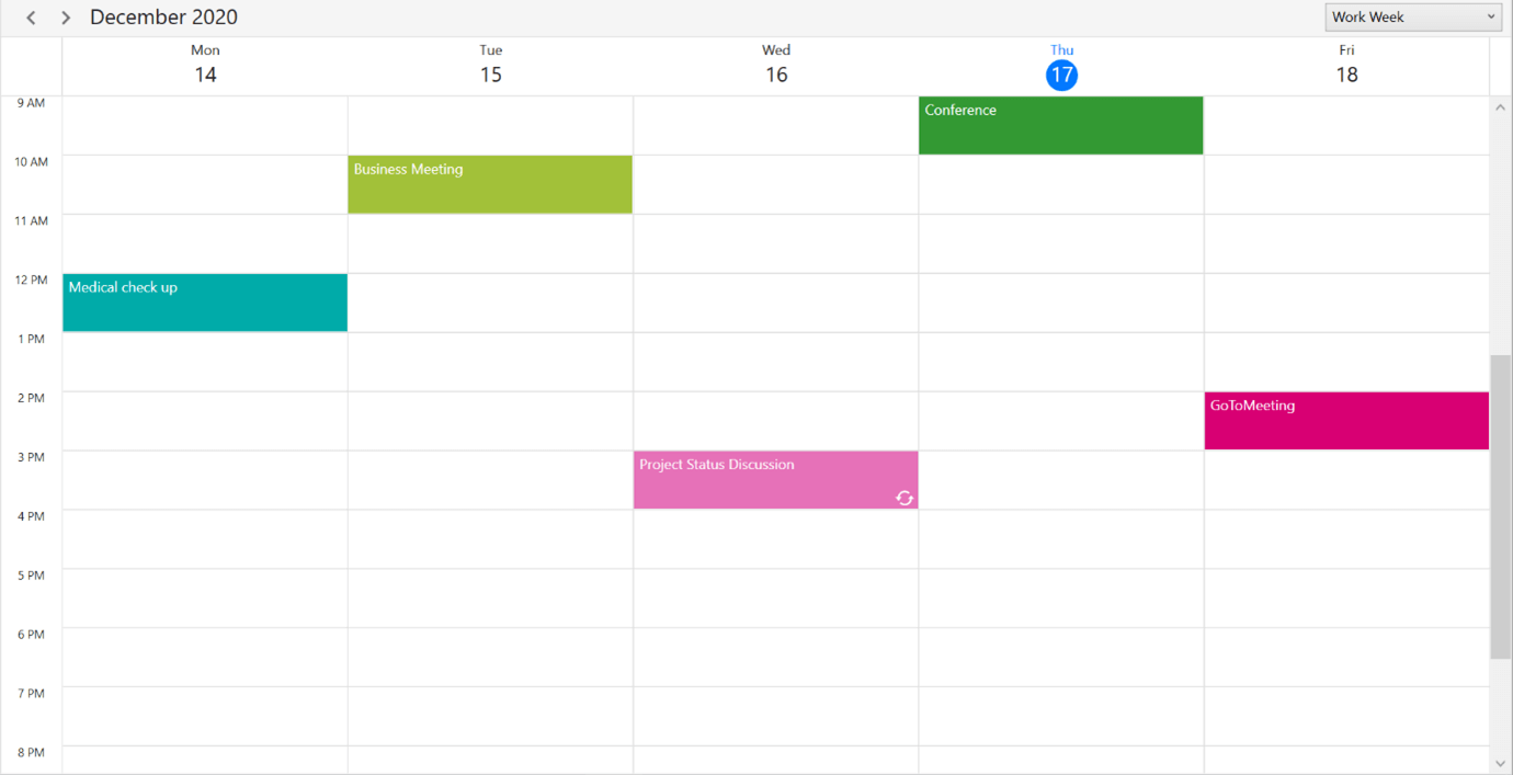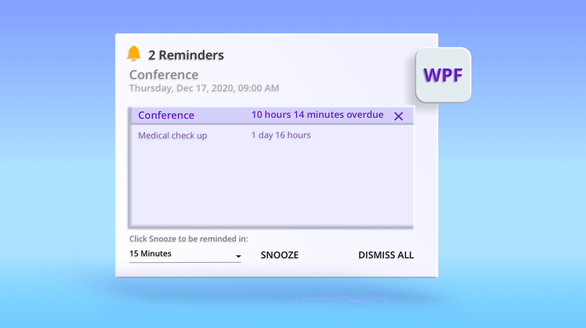 The Syncfusion WPF Scheduler control comes with appointment reminder support in the 2020 Volume 4 release. This will alert you to appointments via reminders with complete data-binding support. You can also send reminder messages through SMS or email with the help of external packages to keep track of appointments.