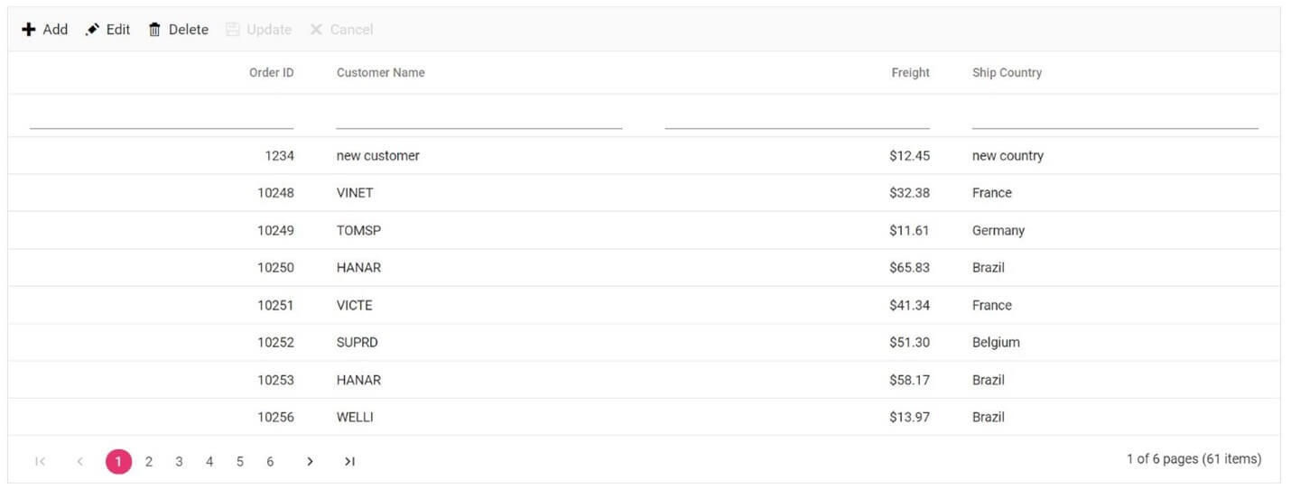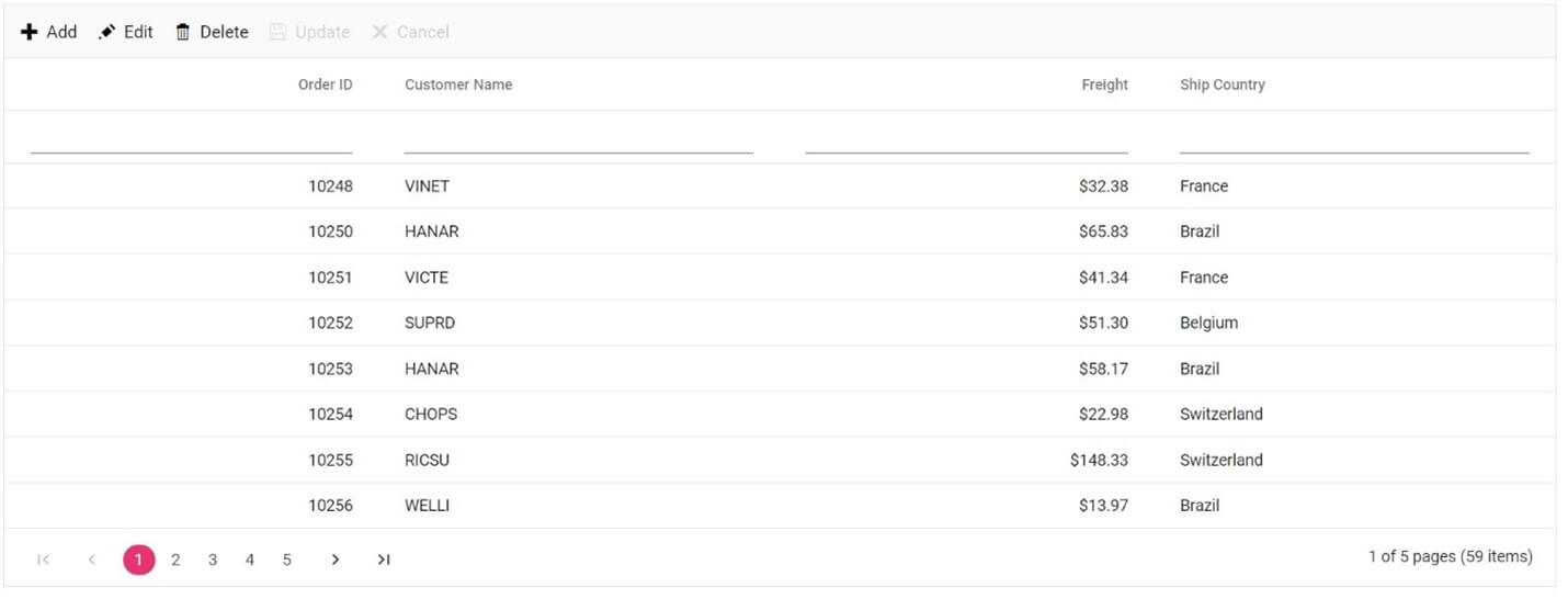 Note: The editing feature requires a primary key column to perform CRUD operations. The primary key should be a unique value. To define the primary key, set the columns.isPrimaryKey to true in the required column.