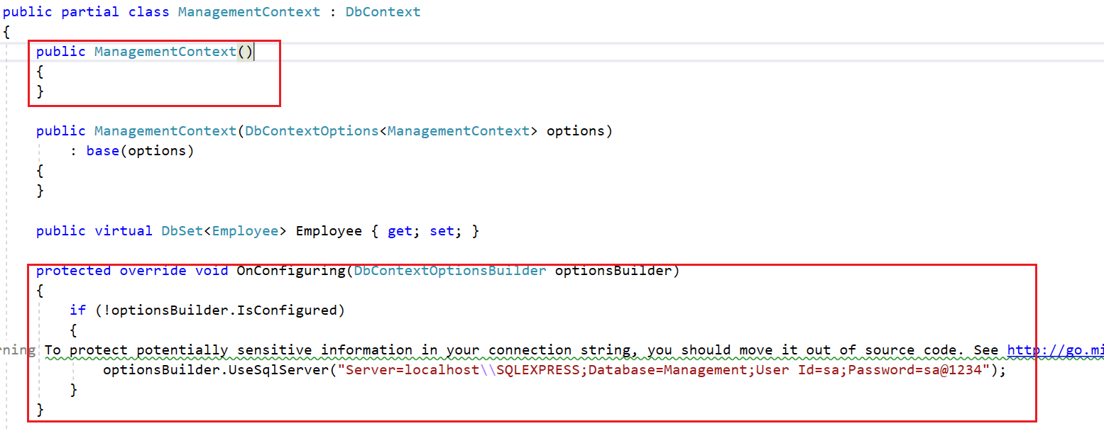 In the auto-generated EmployeeContext class file, the database credentials you can see are hard coded in the OnConfiguring method. It is not a good practice to have SQL Server credentials in C# class, considering the security issues. So, remove the following OnConfiguring method and parameterless constructor from context file.