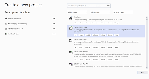 In the Create a new project dialog, select the ASP.NET Core Empty option from the list and click Next.