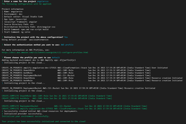 After installation, configure the Angular application with Amplify by executing the amplify init command. It will ask you for several settings, and you can use the previously created IAM user profile as the AWS profile.