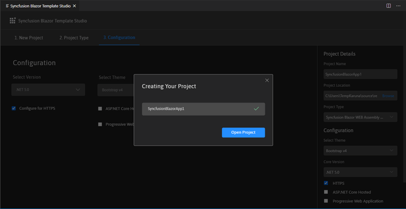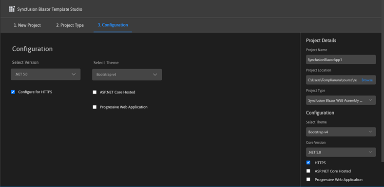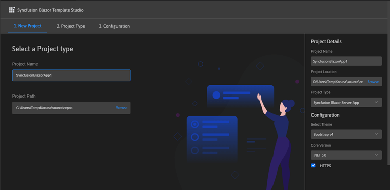 Now, Syncfusion is offering a UI for the Blazor Template Studio. User experience for our products is one of our top priorities because the UI is what people actually use. A good UI increases product usability and reduces developer time to create applications. This user interface for the Template Studio will make it faster for users to get started on their Syncfusion Blazor projects.