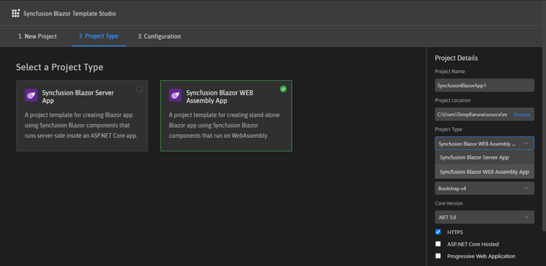 2. Syncfusion Blazor WebAssembly App.Note:Â In the Syncfusion Blazor WebAssembly App project type, we can choose ASP.NET Core-hosted, Progressive Web Application, or both.