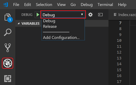 By default, the Blazor application runs in Debug mode. It can be changed to Release mode in the Debug tab (Ctrl+Shift+D).