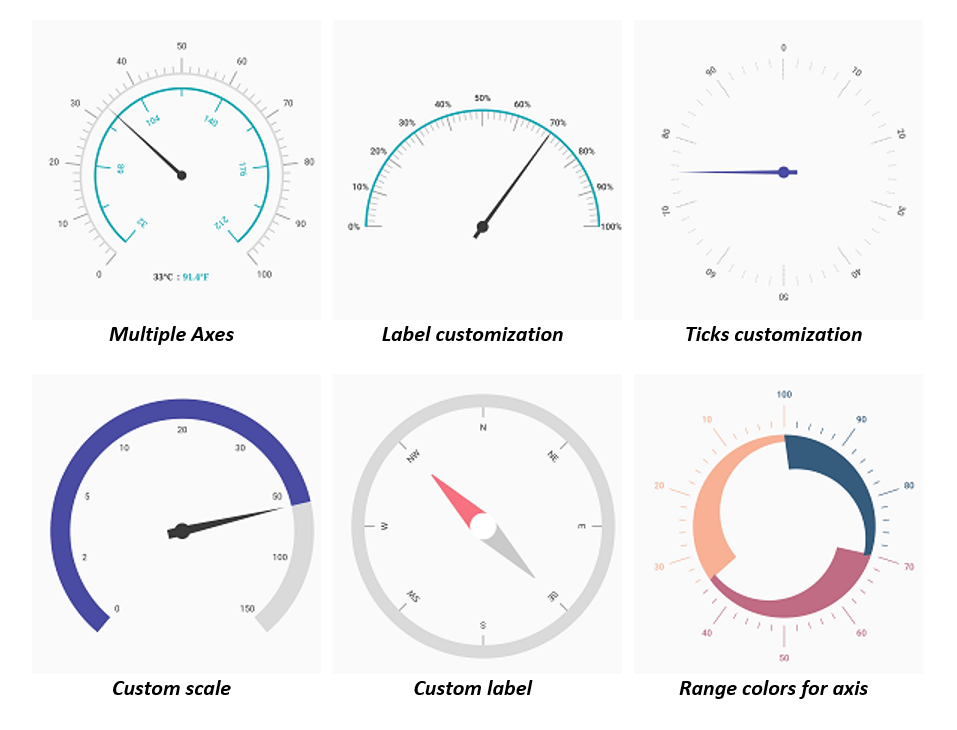 The radial gauge axis is a circular arc on which a set of values are displayed along a linear or custom scale based on the design requirements. You can add any number of axes inside the gauge. Axis features allow users to further customize the gauge axis element to make an axis more readable: label styles, tick styles, label rotation, custom scales, custom labels, inversed axis, outside axis position, and multiple axis support.