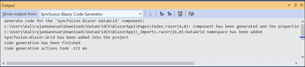5. In the output window, you will see the information about the changes made by the Syncfusion Blazor Code Generator.