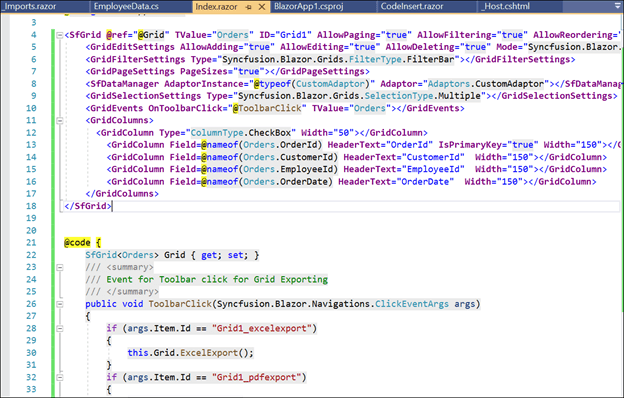 Razor file showing the rendered code for the Syncfusion DataGrid control
