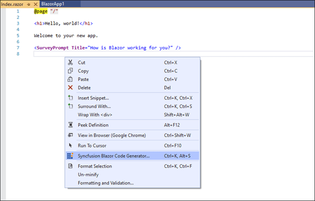 2. To open the Syncfusion Blazor Code Generator wizard, follow one of these options in the Razor file: