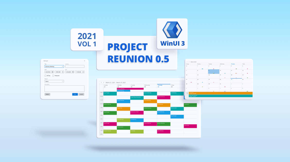 We at Syncfusion released the preview version of our WinUI 3 Project Reunion Scheduler in the 2021 Volume 1 release. The WinUI Scheduler control is used to schedule and manage appointments through an intuitive user interface, like the Windows calendar. It visualizes appointments in different views including day, week, workweek, month, timeline day, timeline week, timeline workweek, and timeline month. With it, users can easily schedule recurring events and appointments in different time zones. It also provides a built-in interface for adding, editing, deleting, and rescheduling appointments, and supports appearance customization and localization to meet the needs of different regions.