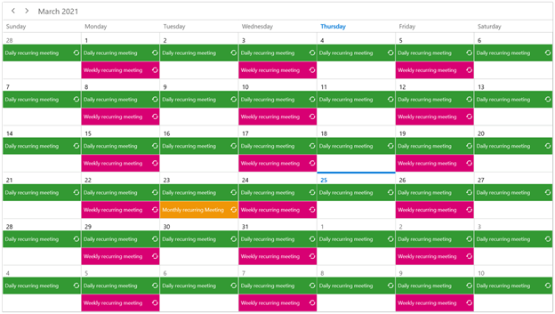 You can easily configure recurring events on a daily, weekly, monthly, or yearly basis. You can also skip or change the occurrence of a recurring appointment.