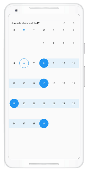 This widget has all the Gregorian calendar functionalities like minimum and maximum dates, the first day of the week, different selection modes, RTL, and customization for special dates.