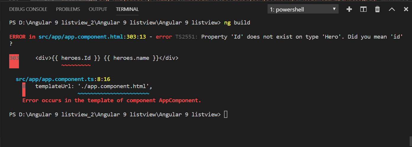 Here, type checking has been done for the entire hero.Id. The following screenshot shows an error in the template of the component AppComponent as the property Id does not exist in it.