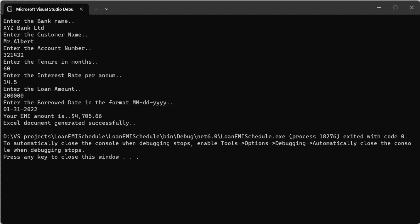 /// <summary> /// Calculate EMI and generate EMI schedule. /// </summary> /// <param name="sheet">Worksheet</param> private static void CalculateEMI(IWorksheet sheet, string bankName, long accountNumber, string customerName, double interestRate, long loanAmount, int tenureInMonths, DateTime borrowedDate) { sheet["A1"].Value = bankName; sheet["A4"].Value = "Loan EMI Schedule"; sheet["A6"].Value = "Customer Name"; sheet["A8"].Value = "Account Number"; sheet["A10"].Value = "Tenure in months"; sheet["A12"].Value = "Interest"; sheet["B6"].Text = customerName; sheet["B8"].Number = accountNumber; sheet["B10"].Number = tenureInMonths; sheet["B12"].Number = interestRate/100; sheet["E6"].Value = "Loan Amount"; sheet["E8"].Value = "Frequency"; sheet["E10"].Value = "EMI Amount"; sheet["E12"].Value = "Borrowed Date"; sheet["F6"].Number = loanAmount; sheet["F8"].Value = "Monthly"; sheet["F12"].DateTime = borrowedDate; sheet["A15"].Value = "Payment No."; sheet["B15"].Value = "Date"; sheet["C15"].Value = "Payment"; sheet["D15"].Value = "Principle"; sheet["E15"].Value = "Interest"; sheet["F15"].Value = "Outstanding Principle"; sheet.Workbook.Names.Add("Interest", sheet["B12"]); sheet.Workbook.Names.Add("Tenure", sheet["B10"]); sheet.Workbook.Names.Add("LoanAmount", sheet["F6"]); sheet.Workbook.Names.Add("BorrowedDate", sheet["F12"]); sheet["F10"].Formula = "=-PMT(Interest/12,Tenure, LoanAmount)"; sheet.EnableSheetCalculations(); double emi = double.Parse(sheet["F10"].CalculatedValue.ToString()); double balance = loanAmount; double totalInterestPaid = 0; for (int i = 1; i <= tenureInMonths; i++) { double interest = balance * (interestRate/100)/12; double principal = emi - interest; balance -= principal; totalInterestPaid += interest; sheet[15 + i, 1].Number = i; sheet[15 + i, 2].Formula = "=EDATE(BorrowedDate," + i + ")"; sheet[15 + i, 3].Number = emi; sheet[15 + i, 4].Number = principal; sheet[15 + i, 5].Number = interest; sheet[15 + i, 6].Number = balance; } IRange used = sheet.UsedRange; sheet[used.LastRow + 2, 4, used.LastRow + 2, 5].Merge(); sheet[used.LastRow + 2, 4, used.LastRow + 2, 5].CellStyle.Font.Bold = true; sheet[used.LastRow + 2, 4, used.LastRow + 2, 5].Value = "Principle"; sheet[used.LastRow + 3, 4, used.LastRow + 3, 5].Merge(); sheet[used.LastRow + 3, 4, used.LastRow + 3, 5].CellStyle.Font.Bold = true; sheet[used.LastRow + 3, 4, used.LastRow + 3, 5].Value = "Interest"; sheet[used.LastRow + 4, 4, used.LastRow + 4, 5].Merge(); sheet[used.LastRow + 4, 4, used.LastRow + 4, 5].CellStyle.Font.Bold = true; sheet[used.LastRow + 4, 4, used.LastRow + 4, 5].Value = "Total Amount"; sheet[used.LastRow + 2, 6, used.LastRow + 2, 6].Number = loanAmount; sheet[used.LastRow + 2, 6, used.LastRow + 2, 6].NumberFormat = "$#,###.00"; sheet[used.LastRow + 3, 6, used.LastRow + 3, 6].Number = totalInterestPaid; sheet[used.LastRow + 3, 6, used.LastRow + 3, 6].NumberFormat = "$#,###.00"; sheet[used.LastRow + 4, 6, used.LastRow + 4, 6].Number = totalInterestPaid + loanAmount; sheet[used.LastRow + 4, 6, used.LastRow + 4, 6].NumberFormat = "$#,###.00"; //Apply styles to the cells. sheet.IsGridLinesVisible = false; sheet["A1:F2"].Merge(); IStyle mergeArea = sheet["A1"].MergeArea.CellStyle; mergeArea.Font.Size = 18; mergeArea.Font.Bold = true; mergeArea.Font.Underline = ExcelUnderline.Single; sheet["A4:F4"].Merge(); sheet["A4"].Value = "Loan EMI Schedule"; mergeArea = sheet["A4"].MergeArea.CellStyle; mergeArea.Font.Size = 16; mergeArea.Font.Bold = true; sheet["A6:A12"].CellStyle.Font.Bold = true; sheet["E6:E12"].CellStyle.Font.Bold = true; sheet["F6"].NumberFormat = "$#,###.00"; sheet["F10"].NumberFormat = "$#,###.00"; sheet["B12"].NumberFormat = "0.0%"; sheet["F12"].NumberFormat = Thread.CurrentThread.CurrentCulture.DateTimeFormat.ShortDatePattern; sheet["A15:F15"].CellStyle.Font.Bold = true; sheet["A15:F15"].WrapText = true; sheet["A15:F15"].RowHeight = 31; sheet.UsedRange.ColumnWidth = 15.5; used = sheet.UsedRange; sheet[16,2, used.LastRow - 4, 2].NumberFormat = Thread.CurrentThread.CurrentCulture.DateTimeFormat.ShortDatePattern; sheet[16, 3, used.LastRow - 4, 6].NumberFormat = "$#,###.00"; sheet[15, 1, 15, 6].BorderAround(ExcelLineStyle.Thin); sheet[15, 1, 15, 6].BorderInside(); sheet[16, 1, used.LastRow - 4, 6].BorderAround(ExcelLineStyle.Thin); sheet[16, 1, used.LastRow - 4, 6].Borders[ExcelBordersIndex.InsideVertical].LineStyle = ExcelLineStyle.Thin; sheet[6, 1, used.LastRow, 6].CellStyle.Font.Size = 12; sheet[16, 1, used.LastRow, 6].RowHeight = 24; sheet[1, 1, used.LastRow, 6].CellStyle.VerticalAlignment = ExcelVAlign.VAlignCenter; sheet[1, 1, used.LastRow, 6].CellStyle.HorizontalAlignment = ExcelHAlign.HAlignCenter; }After running the sample with proper details, the console window will look the following image.