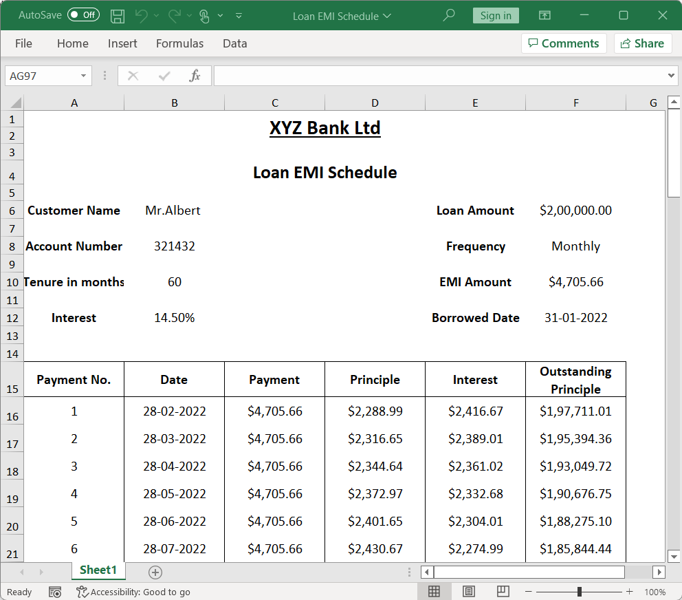 As a developer, you may need to generate loan EMI (equated monthly installment) schedules as part of your finance applications. An EMI schedule is a table that shows the amount of money that needs to be paid each month towards a loan. Generating this EMI schedule in an Excel document will provide additional UI features that enhance the data’s readability.