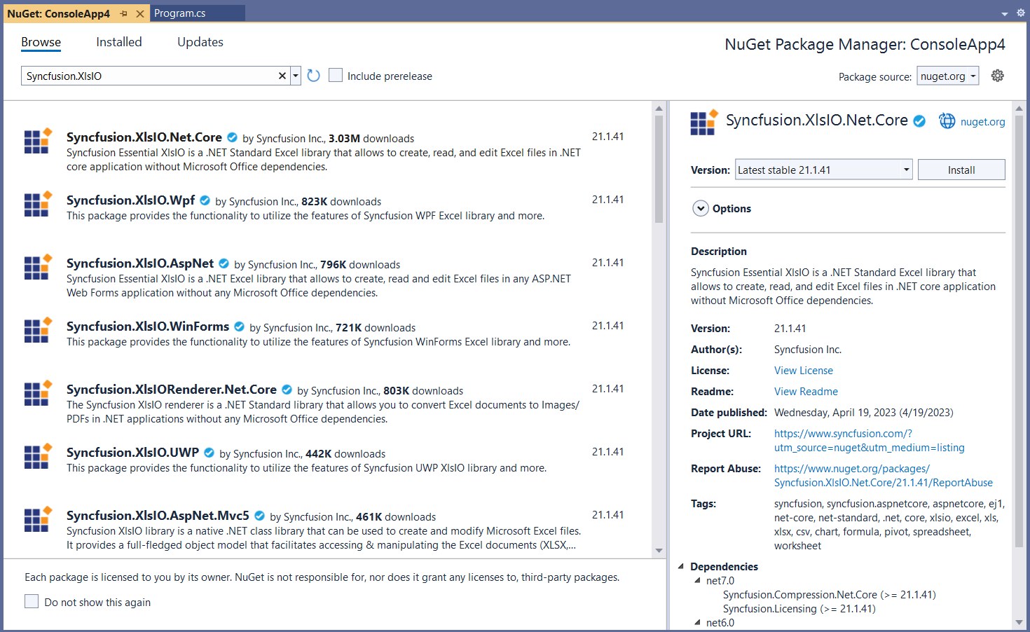 - Then, install the Syncfusion.XlsIO.Net.Core NuGet package.