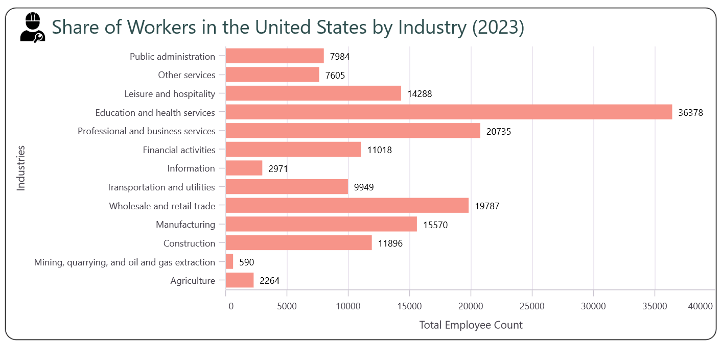 The following image provides a clear visualization of workforce distribution across industries in the US for 2023.