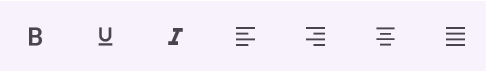 <VerticalStackLayout> <toolbar:SfToolbar x:Name="Toolbar" HeightRequest="56"> <toolbar:SfToolbar.Items> <toolbar:SfToolbarItem Name="Bold" ToolTipText="Bold"> <toolbar:SfToolbarItem.Icon> <FontImageSource Glyph="" FontFamily="MauiMaterialAssets" /> </toolbar:SfToolbarItem.Icon> </toolbar:SfToolbarItem> <toolbar:SfToolbarItem Name="Underline" ToolTipText="Underline"> <toolbar:SfToolbarItem.Icon> <FontImageSource Glyph="" FontFamily="MauiMaterialAssets" /> </toolbar:SfToolbarItem.Icon> </toolbar:SfToolbarItem> <toolbar:SfToolbarItem Name="Italic" ToolTipText="Italic"> <toolbar:SfToolbarItem.Icon> <FontImageSource Glyph="" FontFamily="MauiMaterialAssets" /> </toolbar:SfToolbarItem.Icon> </toolbar:SfToolbarItem> <toolbar:SfToolbarItem Name="AlignLeft" ToolTipText="Align-Left"> <toolbar:SfToolbarItem.Icon> <FontImageSource Glyph="" FontFamily="MauiMaterialAssets" /> </toolbar:SfToolbarItem.Icon> </toolbar:SfToolbarItem> <toolbar:SfToolbarItem Name="AlignRight" ToolTipText="Align-Right"> <toolbar:SfToolbarItem.Icon> <FontImageSource Glyph="" FontFamily="MauiMaterialAssets" /> </toolbar:SfToolbarItem.Icon> </toolbar:SfToolbarItem> <toolbar:SfToolbarItem Name="AlignCenter" ToolTipText="Align-Center"> <toolbar:SfToolbarItem.Icon> <FontImageSource Glyph="" FontFamily="MauiMaterialAssets" /> </toolbar:SfToolbarItem.Icon> </toolbar:SfToolbarItem> <toolbar:SfToolbarItem Name="AlignJustify" ToolTipText="Align-Justify"> <toolbar:SfToolbarItem.Icon> <FontImageSource Glyph="" FontFamily="MauiMaterialAssets" /> </toolbar:SfToolbarItem.Icon> </toolbar:SfToolbarItem> </toolbar:SfToolbar.Items> </toolbar:SfToolbar> </VerticalStackLayout>Refer to the following output image.