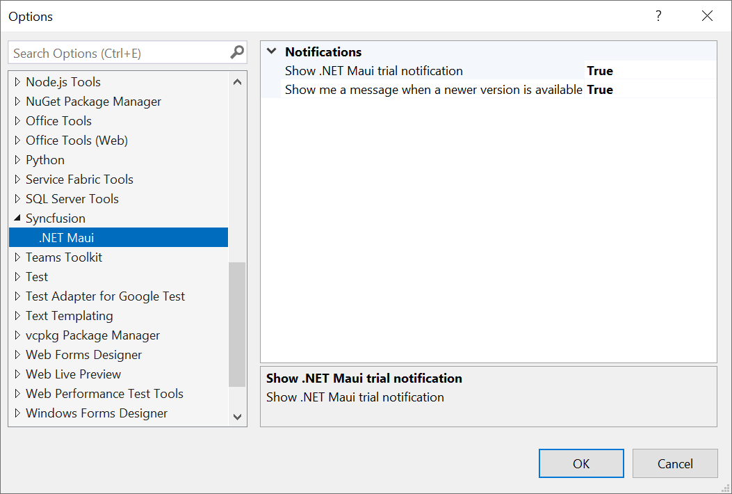 To enable the notifications, open Visual Studio and navigate to Debug -> Options -> Syncfusion. Locate the desired platform and set the Trial and Newer versions as True. By doing so, Syncfusion notification support will be enabled.