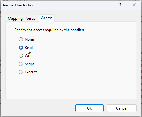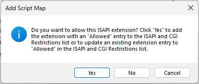 - Right-click anywhere on the page, then choose Add Script Map. In the Add Script Map dialog, enter *.dll as the request path, C:\inetpub\wwwroot\OLAP\msmdpump.dll as the executable, and OLAP as the name. Keep all the default restrictions on this script map. Then, click OK.