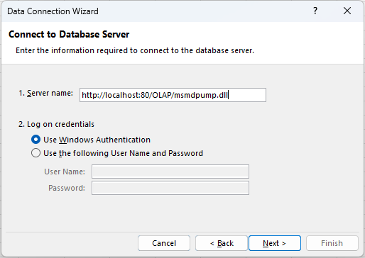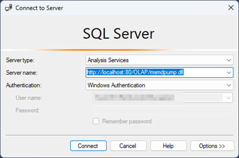 - In the Server name field, enter the HTTP address for the msmdpump extension: http://localhost:80/OLAP/msmdpump.dll.