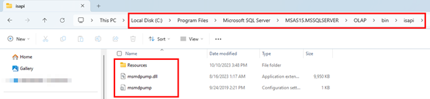 - Copy the files msmdpump.dll, mdmdpump.ini, and the Resources folder from C:\Program Files\Microsoft SQL Server\MSAS15.MSSQLSERVER\OLAP\bin\isapi (adjust the path according to your installation).