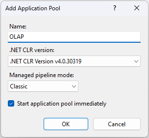 - Using the .NET Framework, create an application pool named OLAP and set the Managed pipeline mode to Classic. Click OK to complete the process.