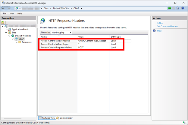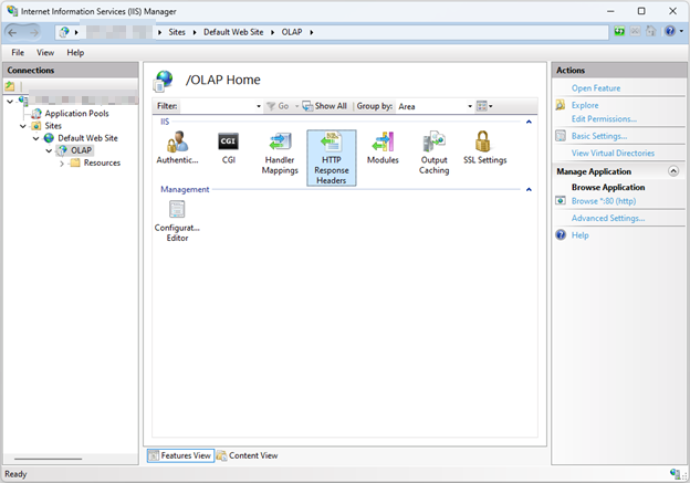 - In the IIS manager, select the OLAP application in the left panel and then double-click on HTTP Response Headers.