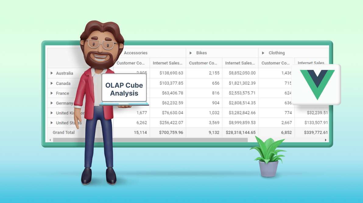 Leveraging OLAP data with the Syncfusion Vue Pivot Table facilitates an intuitive presentation and exploration in tabular and graphical (also known as chart) formats. Additionally, reports can be dynamically customized using features such as the grouping bar and field list, and there is also the option to save reports for future use.