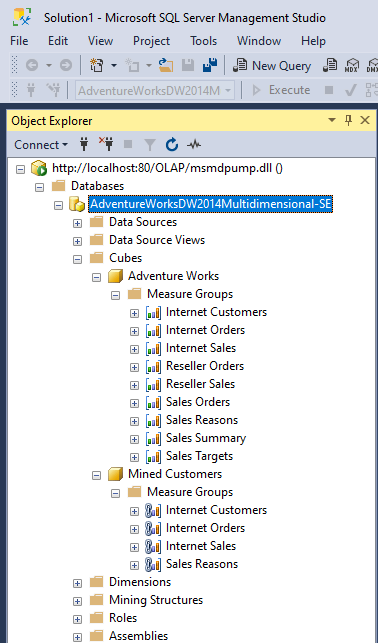 - You can connect to the instance by clicking Next and browse the databases and cubes.