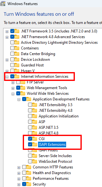 - Go to Internet Information Services, expand it, and then further expand World Wide Web Services and Application Development Features. Verify that both CGI and ISAPI Extensions are selected.