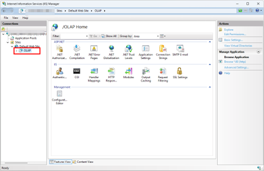 - In IIS Manager, go to the Sites section and locate the Default Web Site. You will see a directory named OLAP. This refers to the OLAP folder you previously created under C:\inetpub\wwwroot.