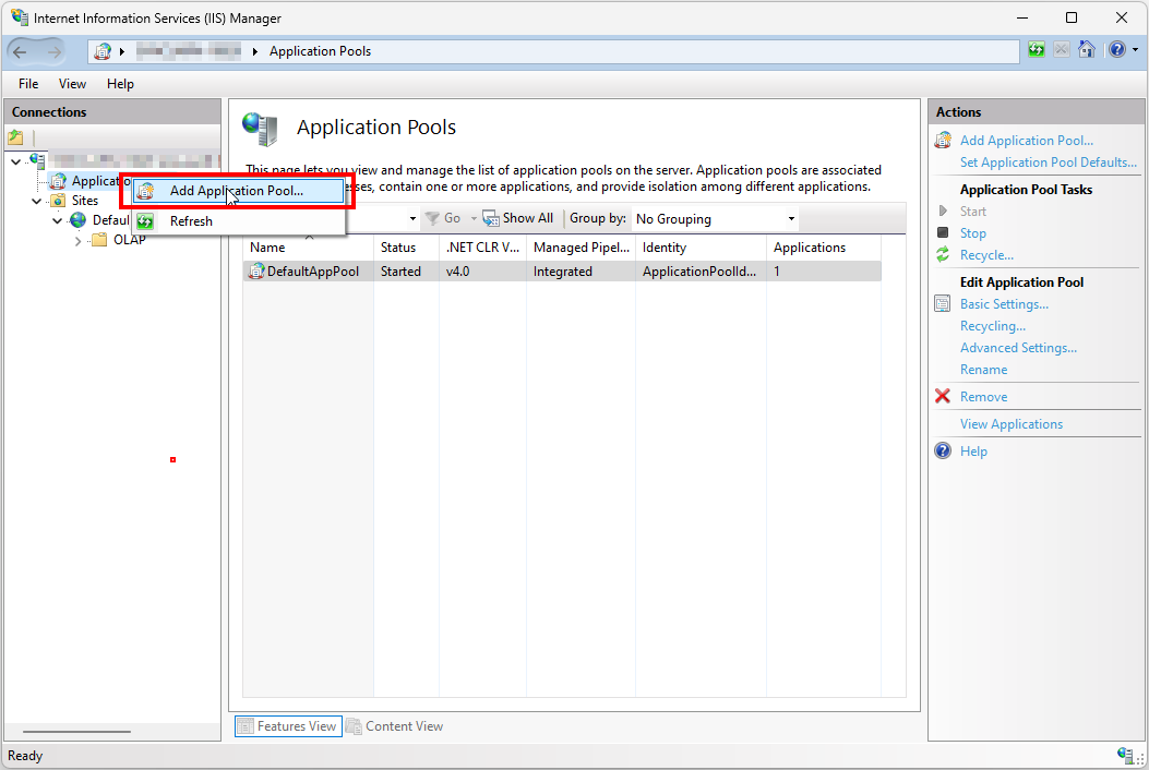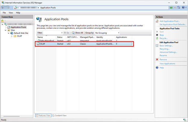 - By selecting the Application Pools on the left panel, you will see the newly created pool named OLAP.