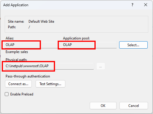 - In the Add Application dialog, enter OLAP as the Alias. Click Select to choose the OLAP application pool and set the Physical Path to C:\inetpub\wwwroot\OLAP. Finally, click OK.