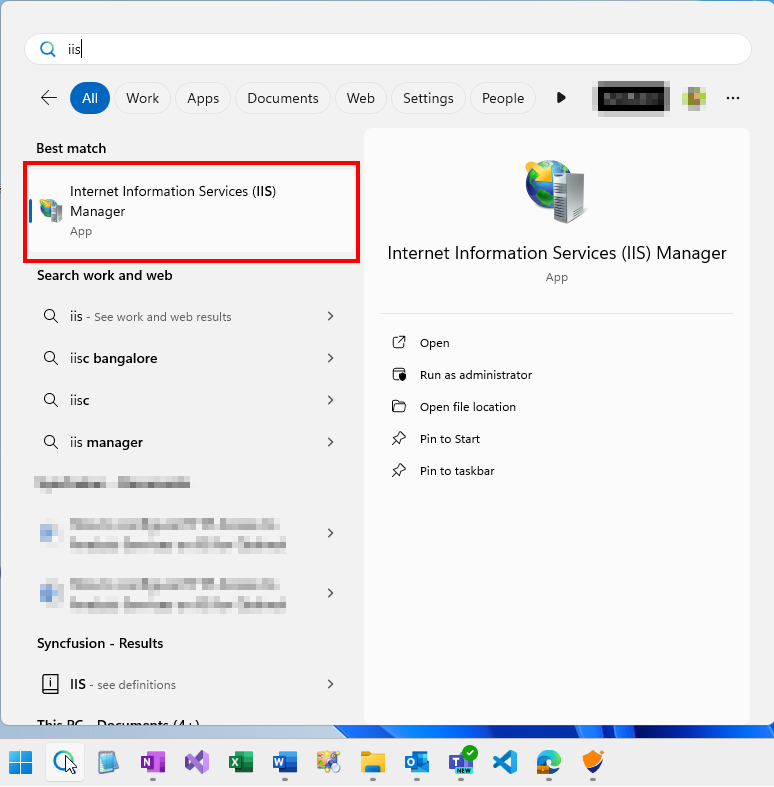 - Once installed, verify by searching for IIS in the Start menu and selecting Internet Information Services (IIS) from the search results.