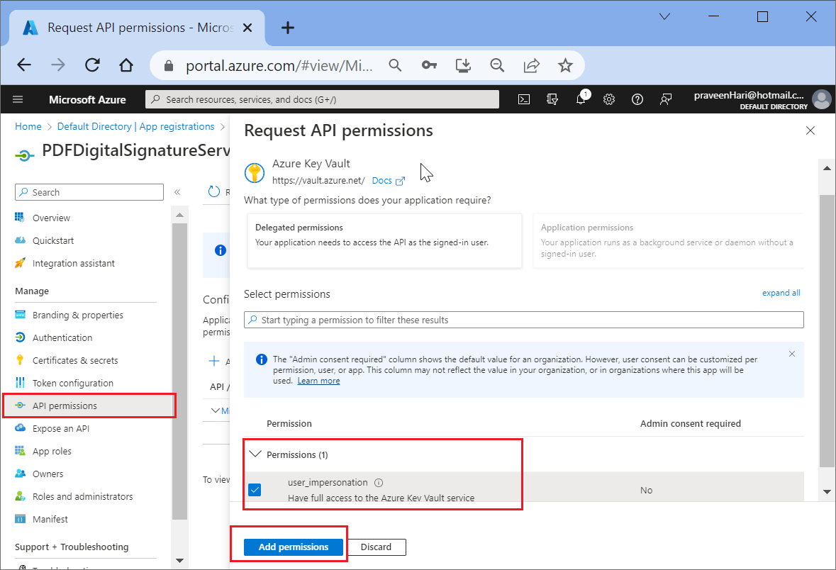 Step 3: Now select API permissions from the side menu and click Add permission. Select the Azure key vault, choose full access, and complete this process by clicking Add permissions.