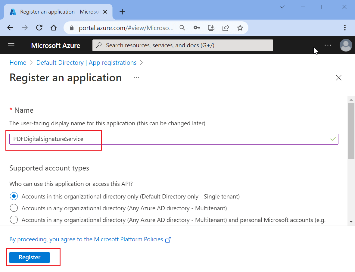 Step 3: In this window, select the application we created in the previous section, PDFDigitalSignatureService, and click Create.