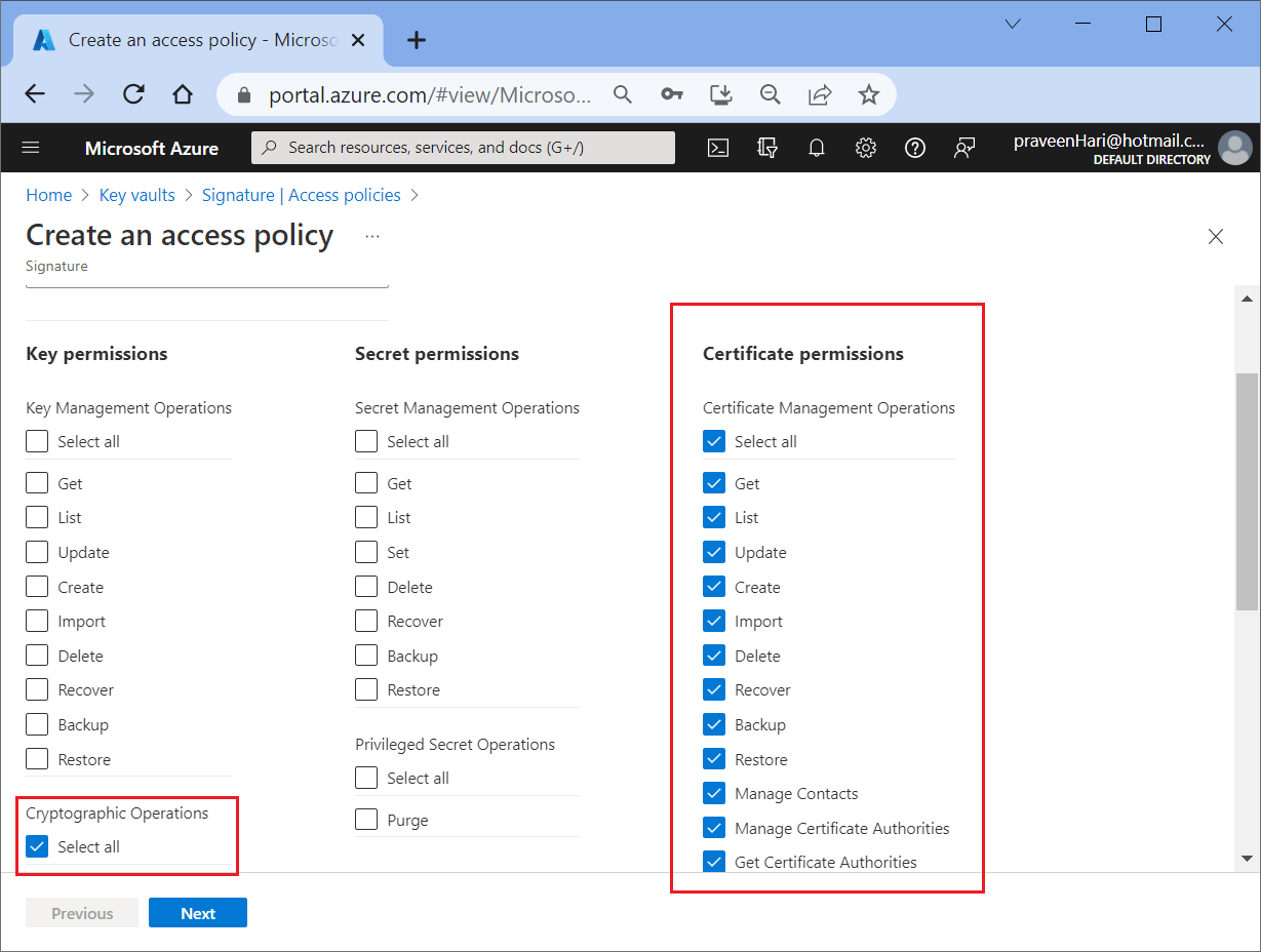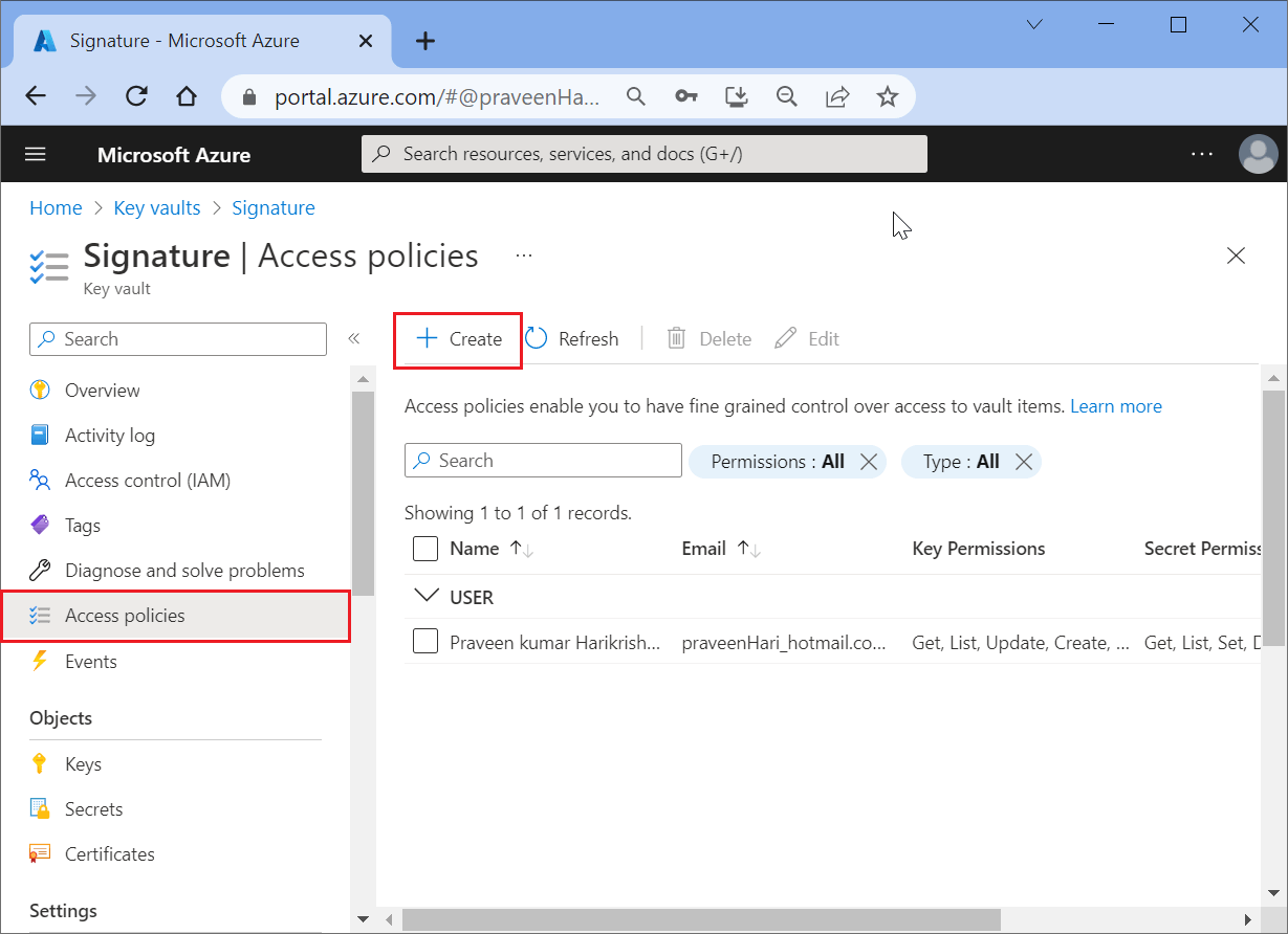 Step 1: Go to the Azure key vault, select Access policies, and click Create.
