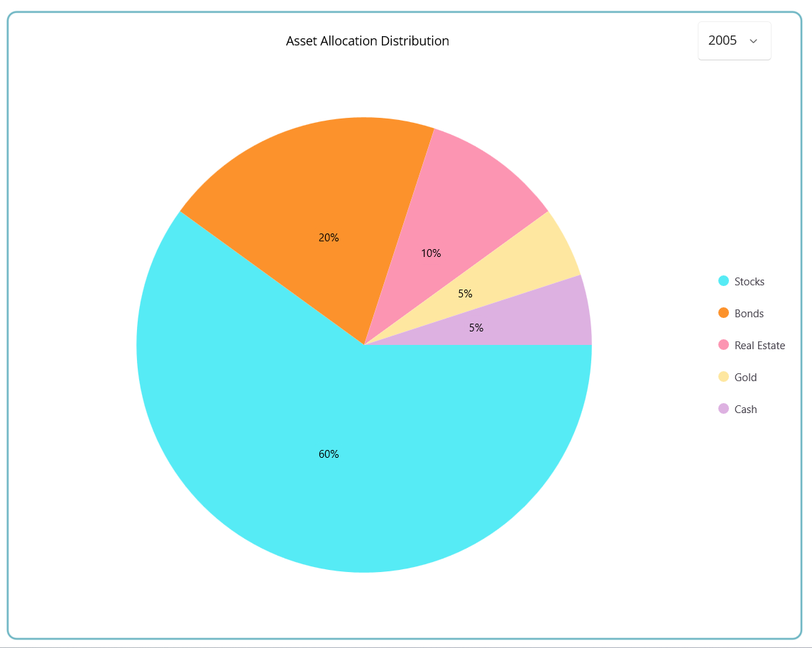 Additionally, we will use a Line Series to illustrate portfolio growth over the past 20 years. This series visualization will highlight how the value of investments has evolved, showcasing trends in appreciation, market downturns, and recovery periods. A steady upward trend signifies consistent growth, while fluctuations reflect market volatility.