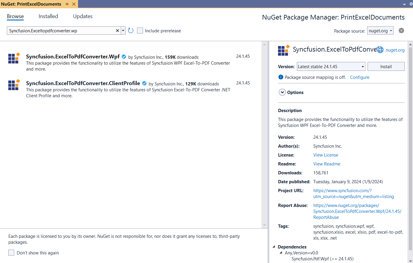 Finally, add the following code in the MainWindow.xaml.cs file to convert the Excel document to PDF using the Syncfusion Excel-to-PDF converter and print the document.