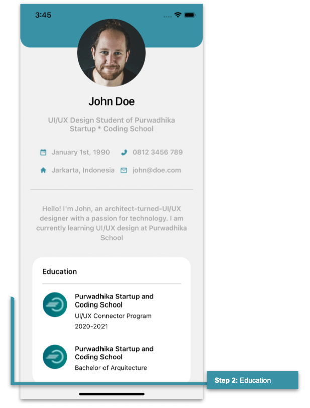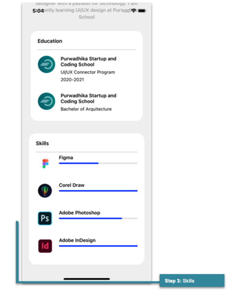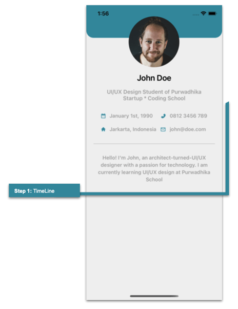 <!--Line and descripcion--> <BoxView Grid.Row="5" HorizontalOptions="FillAndExpand" HeightRequest="1" Color="Silver" Margin="20,0"/> <Label Grid.Row="6" FontSize="14" FontAttributes="Bold" TextColor="#a7a7a7" Margin="20" LineHeight="1.2" HorizontalTextAlignment="Center" Text="Hello! I'm John, an architect-turned-UI/UX designer with a passion for technology. I am currently learning UI/UX design at Purwadhika School"/> <!-- You must write here what is explained in the next code block -->