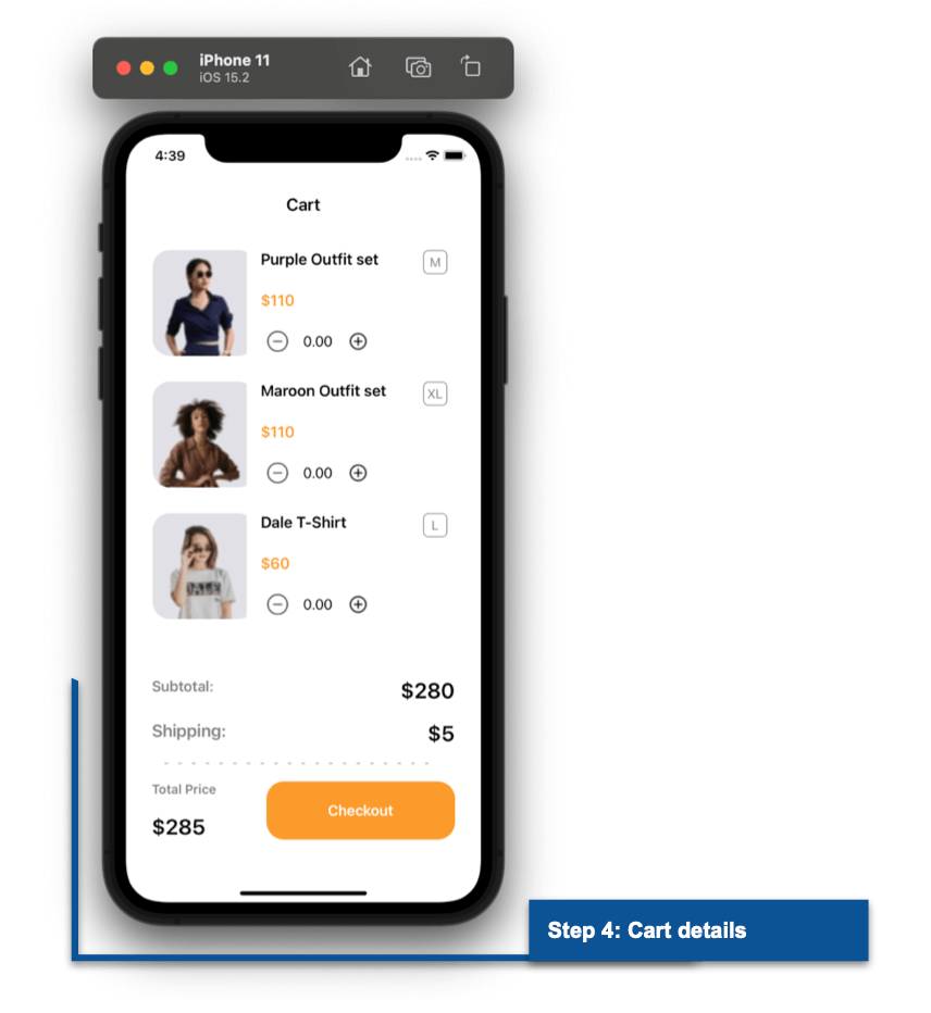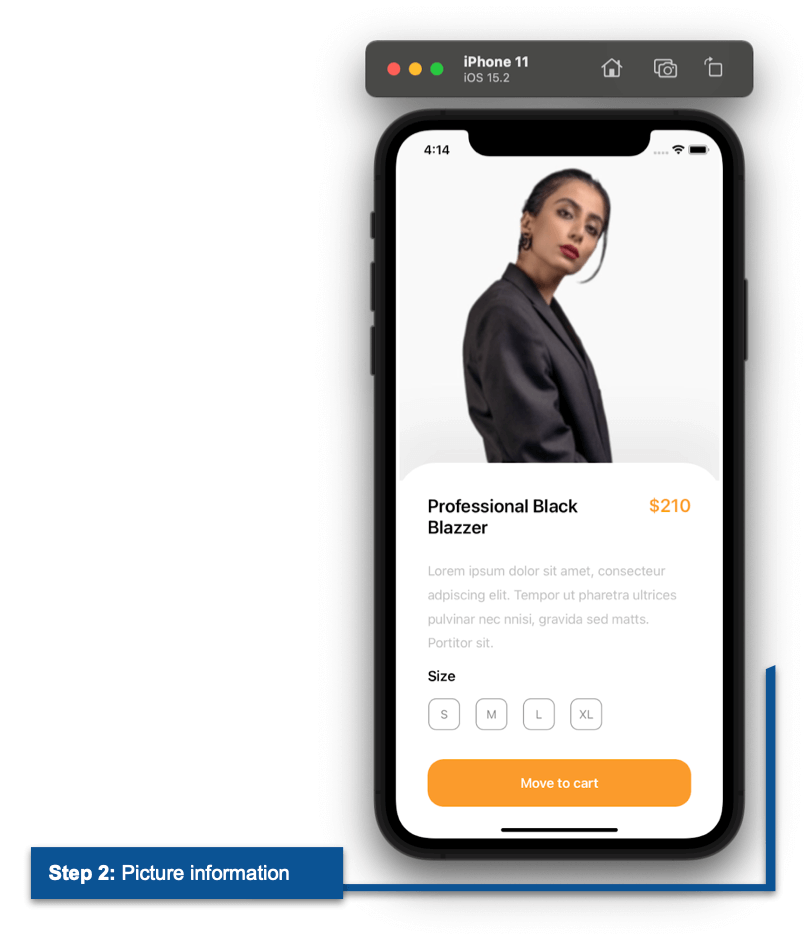 Our UI contains two screens: fashion details and cart. We are going to develop the UI based on the steps specified in this image: